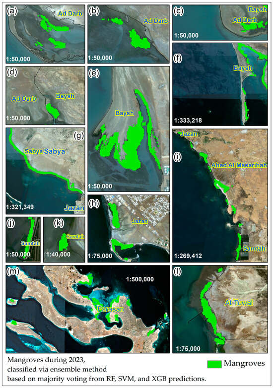 Mangroves along the Jazan coast in Saudi Arabia during 2023, classified using an ensemble model based on majority voting from RF, SVM, and XGB predictions (depicted in green). Subfigures (a–l) pertain to the Jazan mainland coast, while subfigure (m) corresponds to the Jazan islands’ coasts.