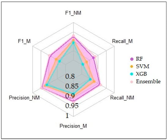 Figure 3 shows the performance of ML classifiers. The ensemble model effectively leveraged the individual strengths of each classifier, leading to improved overall performance, with F1 scores of 95% for mangrove classification and 92% for non-mangrove classification. Additionally, the ensemble model exhibited high precision (94.76% for non-mangroves and 92.45% for mangroves) and recall (90.42% for non-mangroves and 92.45% for mangroves), indicating robust accuracy in identifying and classifying instances across both categories.