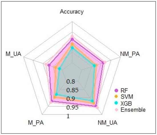 Based on the independent accuracy assessment, the kappa coefficients for the models are as follows: RF achieved a kappa of 0.78, SVM scored 0.75, XGB 0.80, and the ensemble with a kappa of 0.86.
