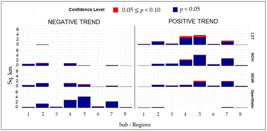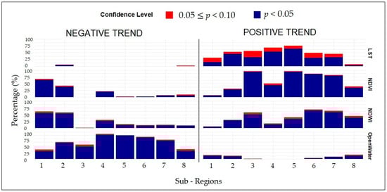 Distinctive patterns emerged in the NDVI, NDWIveg, NDWIow, and LST trends. Figure 5 presents the trends in area, while Figure 6 displays the trends in percentages. The main land areas, such as Baysh and Sabya, presented significant positive NDVI trends, indicating improved vegetation health. Ahad Al Masarihah and Baysh presented both substantial negative and positive NDWIveg trends, highlighting localized fluctuations in vegetation moisture and water availability. Additionally, positive LST trends were detected in mainland regions, particularly Sabya and Baysh. Farasan Island displayed the largest positive trends in the NDVI, NDWIveg, and LST, which are indicative of favorable mangrove health. NDWIow trends revealed a considerable decline in both mainland and island areas, possibly due to improved NDVI. The varied LST patterns across the mainland and island regions emphasize the interplay of coastal and terrestrial factors, with island ecologies showing a stronger warming response, likely because unique land–sea dynamics affect heat retention and transfer.