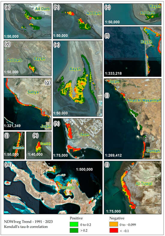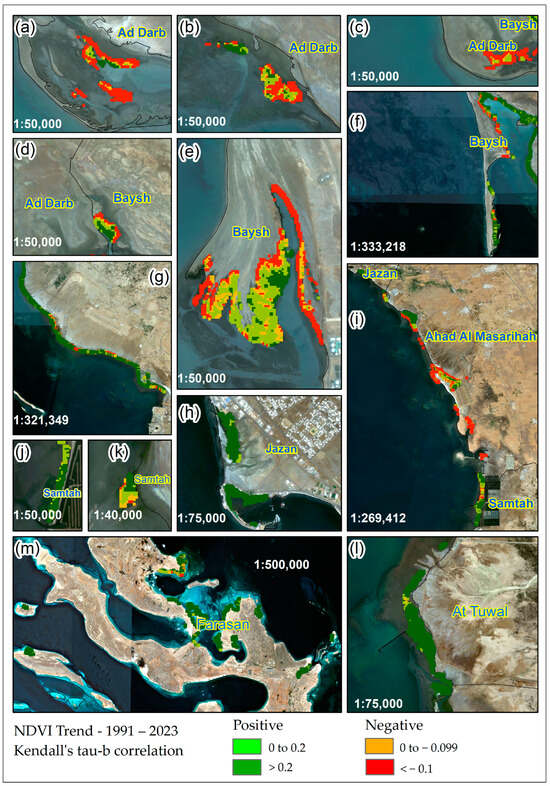 NDVI trends based on Kendall’s tau-b correlation (1991–2023) for the Jazan Coast region (Saudi Arabia). Subfigures (a–l) pertain to the Jazan mainland coast, while subfigure (m) corresponds to the Jazan islands’ coasts.