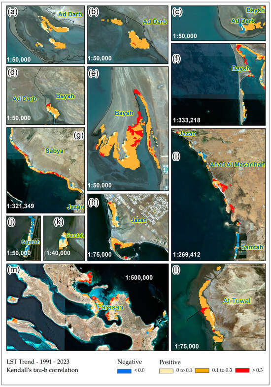 LST trends based on Kendall’s tau-b correlation (1991–2023) for the Jazan Coast region (Saudi Arabia). Subfigures (a–l) pertain to the Jazan mainland coast, while subfigure (m) corresponds to the Jazan islands’ coasts.