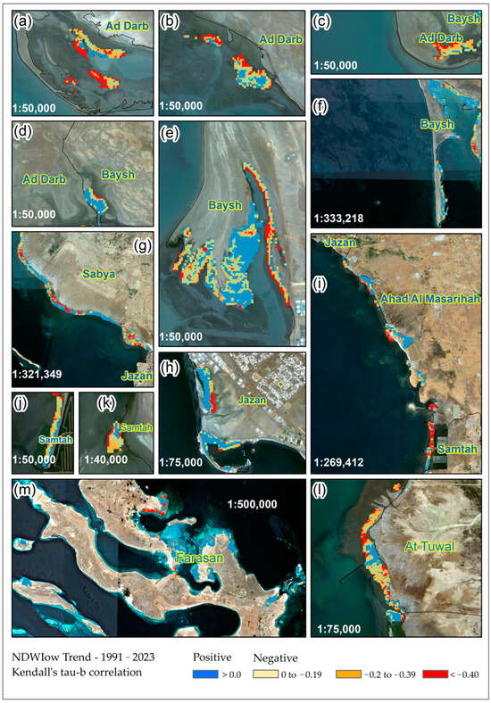 NDWIow trends based on Kendall’s tau-b correlation (1991–2023) for the Jazan Coast region (Saudi Arabia). Subfigures (a–l) pertain to the Jazan mainland coast, while subfigure (m) corresponds to the Jazan islands’ coasts.