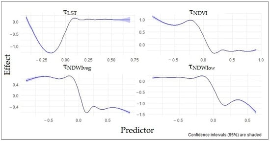 Response curves of predictors (τLST, τNDVI, τNDWIveg, τNDWIlow) derived from Generalized Additive Model (GAM) analysis for predicting ecological stress on mangroves. The curves illustrate the effect of each predictor on the response variable, with 95% confidence intervals shaded to indicate uncertainty in the model predictions.