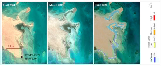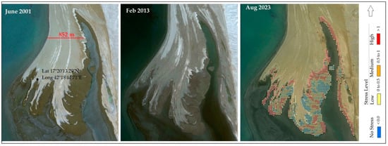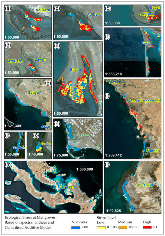 Figure 12 illustrates the level of ecological stress to mangroves in Jazan coast. The classification scheme for stress levels aligns with the GAM-based model, enabling differentiation of mangrove ecological stress. This structured approach effectively captures ecological gradients, where declining NDVI, NDWIveg, and NDWIow trends or rising LST trends indicate increasing stress. The mainland coast has higher ecological stress levels than the island coasts of Farasan Island, where “no stress” areas are predominant. This difference suggests the significant impact of human activities on the mainland, contributing to higher stress levels in regions such as Ahad Al Masarihah and Baysh.