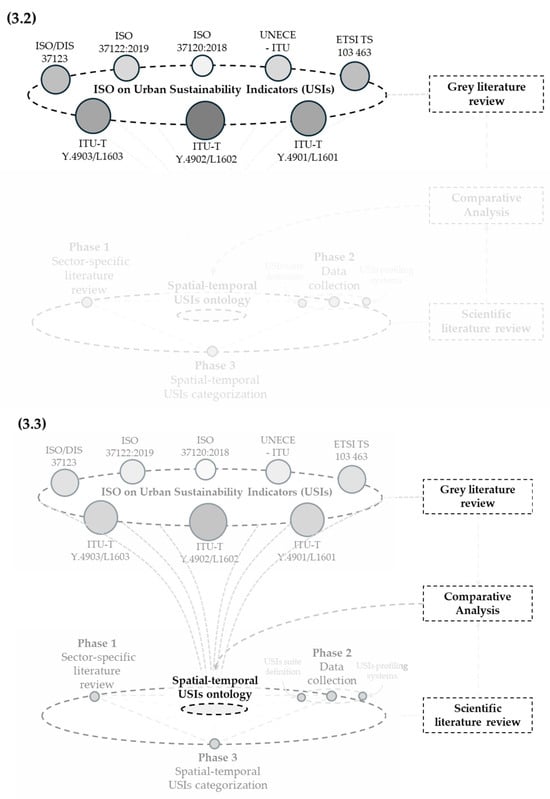 The ontological apparatus on which the project hinges was constructed through a two-pronged approach. One method proceeded to the exploration of urban sustainability indicators from the existing body of knowledge (Section 3.1), while the other method focused on the examination of the existing urban sustainability ISO standards (Section 3.2). The outcome of certain research methods was utilized for comparative analysis (Section 3.3) aimed at the construction of a spatial–temporal USI ontology. In detail, the research methodology employs a comprehensive three-phase approach to develop a spatial–temporal USI ontology.