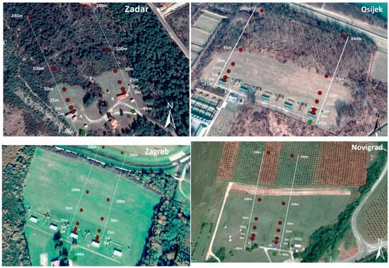 Forest trees and shrubs of the Salicaceae, including poplars (Populus spp.) and willows (Salix spp.), dominate in the vicinity of the ZG and OS shooting ranges. Mediterranean shrub vegetation dominates around the shooting range in ZD, while arable land, olive trees and vegetables dominate around the shooting range in NG. All the areas and land uses investigated are shown in Figure 2.
