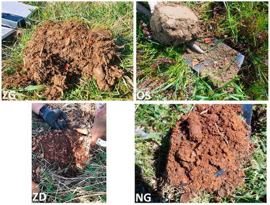 A total of 144 soil samples were collected and analysed. In ZG and OS, the soil type was defined as fluvisol on alluvial deposits of the rivers Sava (ZG) and Drava (OS); in ZD, the soil type is leptosol, with a significant amount of gravel and stones (21 vol%, Table 1); and the soil type in NG is luvisol [41] or much more commonly known as Mediterranean shallow terra rossa (Figure 3).