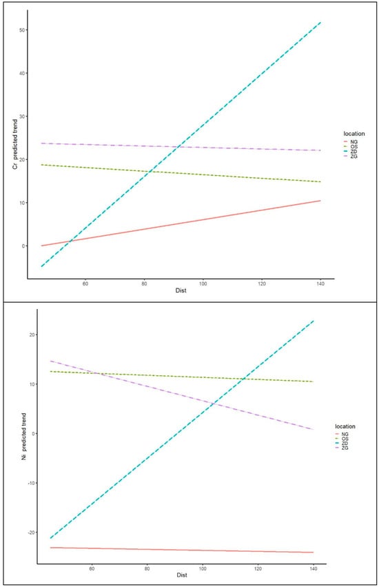 Table 4 shows the p-values of statistical analysis (interactions) for all the investigated elements at different locations, distances and usage of lines, while Figure 4 shows the trends. The interactions between locations and distribution, according to distance for the investigated elements, were calculated using the model described in Section 2.5 and are shown below.