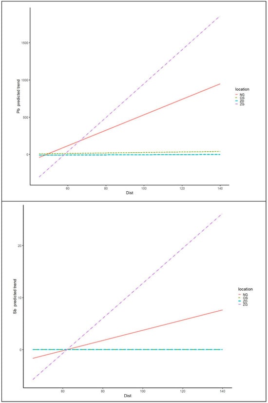 Table 4 shows the p-values of statistical analysis (interactions) for all the investigated elements at different locations, distances and usage of lines, while Figure 4 shows the trends. The interactions between locations and distribution, according to distance for the investigated elements, were calculated using the model described in Section 2.5 and are shown below.
