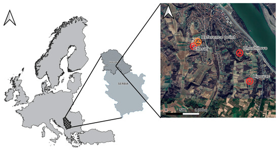 Location of the study region in the territory of the Republic of Serbia and the Autonomous Province of Vojvodina, with the sampling sites and reference point with a control soil.