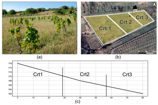 Vineyard in Cherat: (a) General view. (b) Location of sampling zones: upper Crt 1, middle Crt 2, and lower Crt 3 parts of the slope. (c) Scheme of longitudinal profile of the slope with eastern exposure.