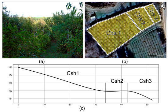 Vineyard in Chushilovo: (a) General view. (b) Location of sampling zones: upper Csh 1, middle Csh 2. and lower Csh 3 parts of the slope. (c) Scheme of longitudinal profile of the slope with eastern exposure.