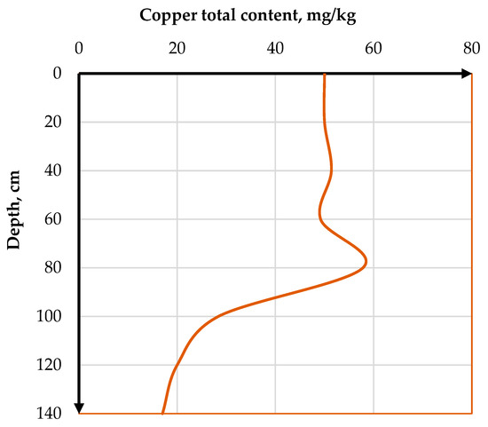 Total copper content in reference soil varied in the 0–20, 20–40, 40–60, and 60–80 cm horizons in a rather narrow range of 49.2–57.8 mg/kg, with a mean value of 52.1 mg/kg. In the 80–100 cm horizon of the reference soil, the element content consistently decreased to 120–140 cm, where it reached values of 20.0 and 17.0 mg/kg, respectively, with a mean value of 18.5 mg/kg (Figure 6).