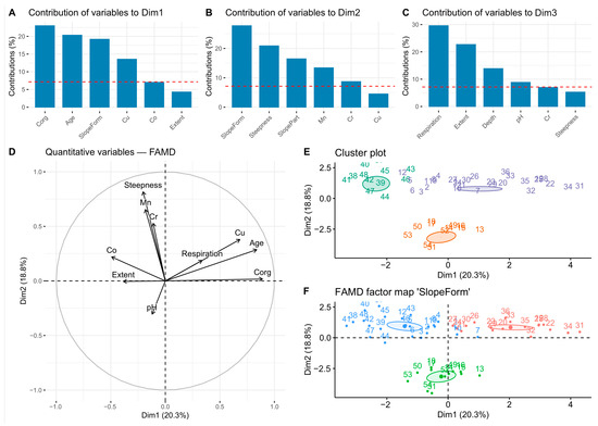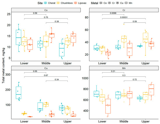 The data were processed using the R software environment for statistical computing and graphics. The FactoMiner package was used for factor analysis of the mixed data (FAMD) [42] and the FactoExtra package for visualization [43,44]. All variables except Cu, Mn, Cr, Co, and Corg were normally distributed according to the Shapiro–Wilk test (p < 0.05). Hence, a nonparametric test for group comparison was used (Kruskal–Wallis).