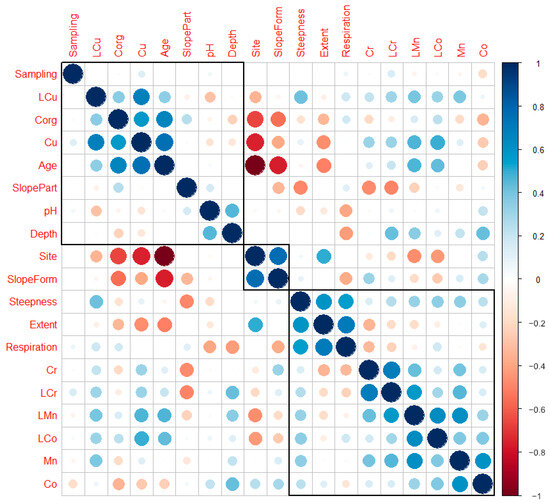 The correlation matrix confirmed the relationship between total copper content, organic matter content, slope part, and slope shape, indicating the involvement of organic matter together with copper in erosion-induced slope migration processes (Figure 10). A similar conclusion was reached in the work of Ha Pham et al. (2022) [56]. This can be explained by the fact that most of the copper is retained by soil organic matter due to its strong sorption and complexation properties [22,57,58,59].