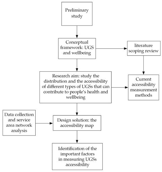 The paper is organised according to the research framework (Figure 1). First, we examine the existing literature on urban green spaces and wellbeing presented in the Introduction with the aim of defining the morphological and physical characteristics that urban green spaces should have in order to contribute to people’s health and wellbeing. Second, we define and frame the goals of the research, also exploring the current accessibility methods presented in various studies. To explore the distribution of UGSs that can contribute to people’s health and wellbeing, we define a method that is used to draw the accessibility map based on the identification of various types of UGSs. The design solution of the accessibility map is presented at various scales in the Section 3. Finally, as presented in the Section 4, we define important factors to be considered when determining accessibility in a dense metropolitan area.