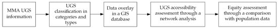 The methodology involved five different steps (Figure 2), starting with data collection on UGSs in the MMA, by classifying them into categories and developing a GIS database that collects different information, yielding an accessibility measurement. Before we undertook this research, there was no existing map of the MMA containing information about UGSs and the characteristics that may contribute to the wellbeing of local citizens. As such, the researchers developed the maps presented in this contribution by overlapping different databases and selecting the features of each UGS based on criteria defined in the existing literature. This identification allowed us to assess the accessibility of UGSs through a network analysis that considered different contextual conditions.