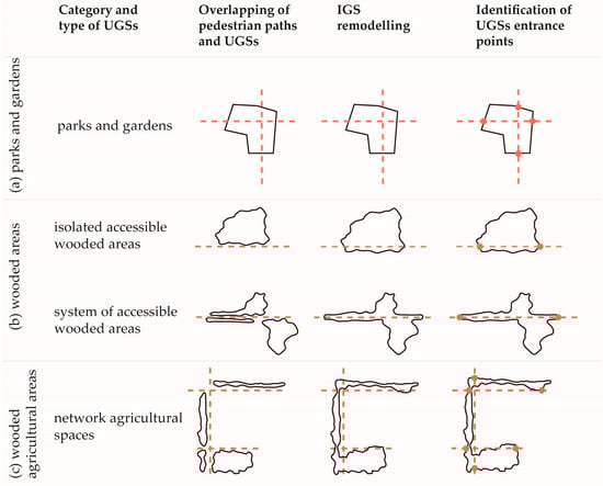 We used the ArcGIS service area network analysis, through a distance cost analysis using the time necessary to travel from a source. In this analysis, we considered all the intersection points between open green spaces and the pedestrian path network. These points represent entrances to parks, gardens, wooded areas, and agricultural spaces or systems of UGSs, which are highlighted as red dots in Figure 4. Considering that IGSs consist of various singular natural elements such as meadows, wooded areas, rows of trees or shrubs and agricultural fields, it was necessary to consider an entire system of green spaces instead of individual elements. For instance, we reshaped the features of categories (b) and (c) by creating a complete perimeter to allow the model to calculate the accessibility of an entire group of natural elements (Figure 5).