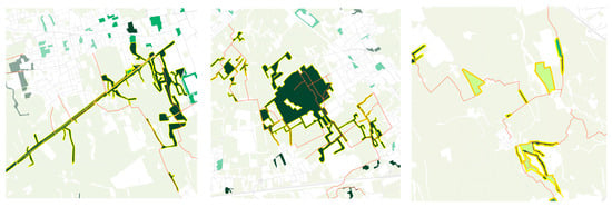 Figure 8 shows different segments of the MMA, corresponding to urban, peri-urban and agricultural contexts. The second column shows the accessibility modelled only on the green routes, which form a smaller area than the ones in the first column. Figure 8a illustrates a dense and heterogeneous residential structure with various industrial sections connected to the infrastructures. Open green spaces are fragmented and assigned to the first category, namely parks and gardens. The images show that trees are almost entirely absent in the residential and industrial areas, meaning that they are designed in such a way that the open spaces are not connected accessibly. The urban structure reveals discontinuity in the tree canopy, which is mainly evident when conducting examinations of the industrial and residential areas.