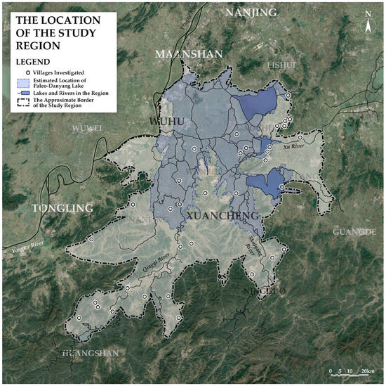 The region’s hydrological framework is dominated by the Shuiyang and Qingyi Rivers, which originate from the northern slopes of the Huangshan Mountains (Anhui Province). Flowing northward, these rivers traverse municipal administrative divisions, including Huangshan, Xuancheng, Wuhu (Anhui), and Nanjing (Jiangsu), collectively shaping the basin’s drainage network and influencing rural settlement patterns. Central to this system is the paleo-Danyang Lake, a historical lacustrine depression formed by upstream sedimentation and blockage of inflows to the Yangtze River [39]. Over centuries of natural infilling and anthropogenic land reclamation [40], this ancient lake has fragmented into a mosaic of smaller water bodies, including Shijiu Lake, Gucheng Lake, and Nanyi Lake. These are interconnected by an intricate network of natural rivers and artificial canals, giving rise to extensive polders—low-lying agricultural tracts enclosed by dykes to mitigate flooding—which define the region’s landscape.