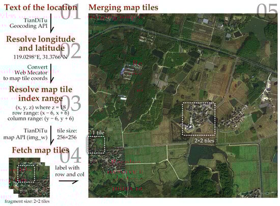 When loading images from Tianditu API, a workflow originating from the name of the villages is carried out. In Tianditu, the villages are treated as POI (points of interest), and their longitude and latitude can be acquired through geocoding API. The longitude and latitude are then resolved as tile indices in the form of a triple tuple (x, y, z). The images’ centering coordinates (x, y) with a zoom level of z are then downloaded through Tianditu map API. The acquired images are 3072 × 3072 in resolution, merging 12 × 12 = 144 tiles, each with a resolution of 256 × 256.