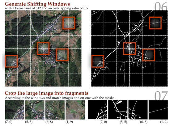To adapt to model input size (512 × 512 pixels) and augment training diversity, large satellite images and their corresponding masks were cropped using a shifting window strategy (Figure 3). The window size was set to 512 × 512 pixels with a stride of 256 pixels (50% overlap), generating 121 non-overlapping sub-images per satellite image. This cropping strategy balances local feature integrity (e.g., preserving continuous alley segments) and dataset size, avoiding over-reliance on large homogeneous regions.