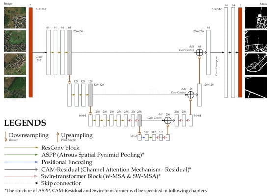 The segmentation of aerial images, especially roads, with the demand of maintaining long-range dependencies calls for a more integrated and complex design of the models. Thus, it has become a trend to merge multiple structures to achieve well-optimized segmentation results. DPIF-Net [35] takes multiple measures like transformers and ASPP to merge global and local information, while Res_ASPP_UNet++ [36] uses depthwise separable convolution and ASPP to reduce model parameters. Sloan et al. [37] used multiple methods to map remote roads using satellite imagery. Yang et al. [38] designed R-MSFNet to extract roads of rural Xiong’an New Area using a self-built dataset and the DeepGlobe dataset.