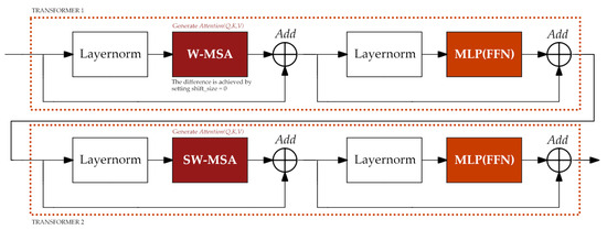 The Swin Transformer module in R-SWTNet is a computationally optimized adaptation of the Swin Transformer architecture (Figure 6), designed to enhance the network’s capacity for capturing long-range dependencies and global context, which is critical for segmenting rural roads with fragmented or occluded segments. The module comprises two consecutive transformer blocks, which work synergistically to balance local detail preservation and cross-region information interaction.