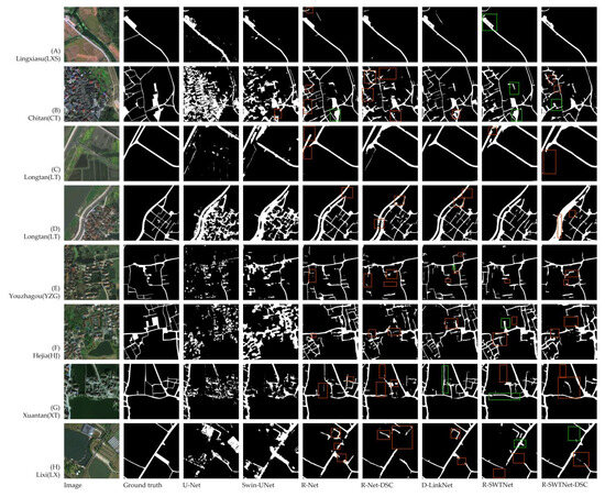 To rigorously evaluate model generalization to unseen rural scenes, eight additional villages from the same region (excluded from SQVillages) were selected as the independent test set, ensuring a comprehensive assessment of model robustness, as shown in Table 2. Test set preprocessing follows the same pipeline as the training data (512 × 512 sliding windows, georeferencing) but with no data augmentation applied to reflect real-world inference conditions. This consistency in preprocessing ensures fair comparison, while the exclusion of test villages from training guarantees unbiased evaluation of the model’s ability to segment narrow alleys, occluded roads, and complex rural topologies in novel environments.