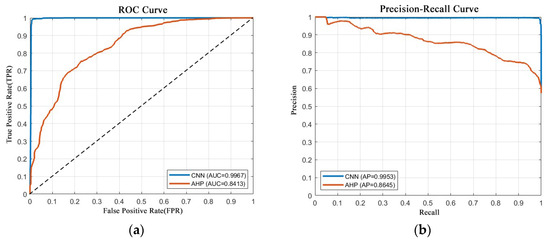To comprehensively evaluate the classification performance of the constructed CNN models, this study employed two widely used assessment tools: the Receiver Operating Characteristic (ROC) curve and the Precision–Recall (PR) curve. The corresponding summary metrics—Area Under the ROC Curve (AUC) and Average Precision (AP)—are calculated as follows: