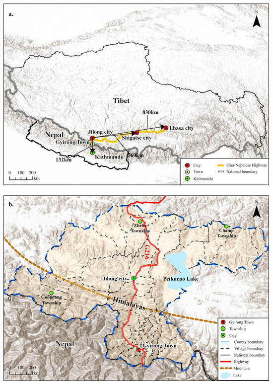 Jilong county-level city, with a territory of 9300 km2 and a population of about 20 thousand, is located in the southwest of Shigatze prefecture-level city, Tibet, bordering Nepal to the south with a borderline of 162 km. The border city administers four townships and two towns, including Gyirong Town, Zongga Town, Zheba Township, Chaina Township, Gongdang Township, and Sala Township. Most of these are located on the border with Nepal. The case city under study, comprising 41 administrative and 56 natural villages, is predominantly situated within the Mount Everest Nature Reserve. Notably, Jilong City, acting as a vital hub connecting South Asia and Tibet, is approximately 132 km from Kathmandu, the capital of Nepal, while it is 560 km from Shigatze City and 830 km from Lhasa City (Figure 1a).