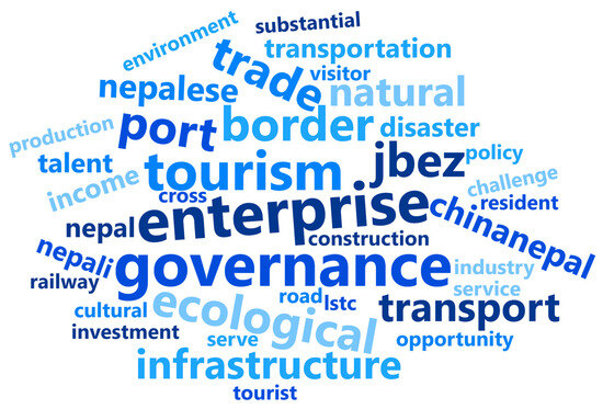 The research conducted a meticulous thematic analysis on the qualitative data procured through comprehensive interviews and participant observations. All interviews were meticulously documented, and the primary perspectives of the respondents were synthesized to create a word cloud (Figure 3). High-frequency keywords such as “governance”, “tourism”, “border”, “trade”, and “transport” emerged, reflecting the core issues of common concern. High-frequency keywords directly correspond to the three major dimensions of research on “China–Nepal channel node cities”—“Transformation Paths” (e.g., Jilong National Border Economic Cooperation Zone (JBEZ) platform, cross-border trade, tourism development), “Challenges” (e.g., ecological vulnerability, talent shortage, insufficient infrastructure) and “Future Measures” (e.g., China–Nepal Railway, ecological protection, talent cultivation), reflecting a high degree of alignment between interview content and research questions. For instance, terms like “ecological vulnerability” and “infrastructure” emphasize the primary challenges associated with green and sustainable development, such as the infrastructural damage caused by geological disasters and the ecological strain due to tourism. Conversely, terms like “JBEZ” and “cross-border trade” highlight crucial strategies for transformation. Collectively, they form a “dilemma-response” logical framework, offering empirical evidence for the countermeasure system proposed in Section 4.3. Notably, terms like “cross-border trade” and “infrastructure” were frequently mentioned in interviews with government, enterprise, and resident groups. This suggests that enhancing “China–Nepal interconnectivity” is a shared priority for Jilong’s transformation and has garnered widespread consensus for future policy directions.