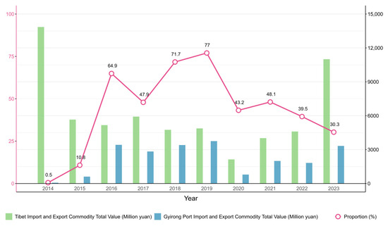 Comparison of the Total Value of Import and Export Goods in Tibet and the Total Value of Import and Export Goods at the Jilong Port from 2014–2023.