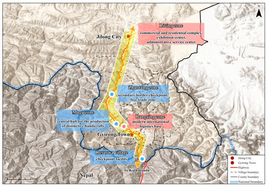 Furthermore, infrastructure planning must be systematic and zonal to maximize functional efficiency. The development of the Shigatze Economic Development Zone exemplifies this approach. It was strategically planned to function as a key entry point for the BRI and a nexus hub for trade logistics radiating to South Asia. This was operationalized through specialized zoning: designating Resuowa village as a joint checkpoint facility; leveraging the Bangxing Zone’s location for a modern international logistics base; developing a living zone in Jilong County with commercial, residential, and administrative service complexes; and planning a secondary border checkpoint and free trade zone in the Zhuotang zone (Figure 6). This model demonstrates that effective infrastructure construction involves not just building isolated projects but orchestrating a synergistic ecosystem of facilities—encompassing logistics, housing, administration, and trade—that collectively support the border city’s upgraded role.