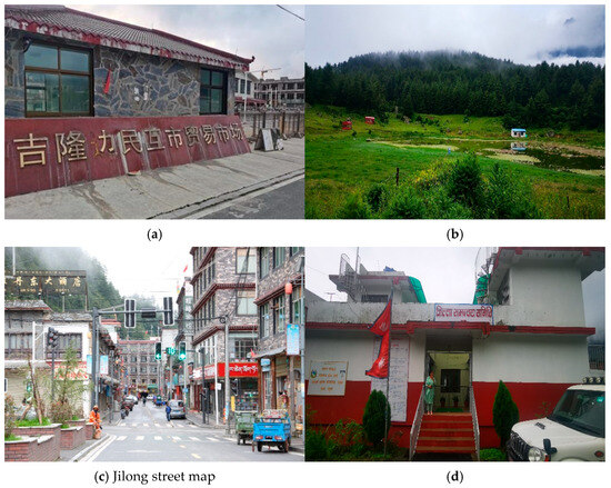 Images in the border area of Jilong. (a) Jilong border petty trade market; (b) Jilong street map; (c) Jilong Natural scenery; (d) Nepal checkpoint office facing Jilong port. Note: The non-English term in the picture (a) refers to Jilong Border Residents’ Mutual Trade Market; the non-English term in the picture (c) refers to Dandong hotel and shop; the non-English term in the picture (d) refers to the check point in Nepal.
