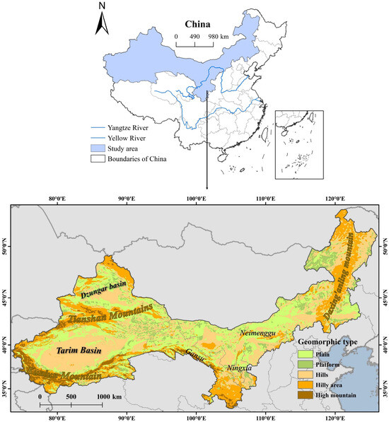 The ASAR of China represent a vast and ecologically significant zone, extending from areas west of the Daxing’anling Mountains in the northeast to territories north of the Qinghai–Tibetan Plateau and Loess Plateau. Encompassing four provincial-level administrative regions (Xinjiang, Gansu, Ningxia Hui Autonomous Region, and Inner Mongolia), this expansive area spans approximately 3.23 × 106 km2, constituting about one-third of China’s total land area (Figure 1). Despite its geographical expanse, the region supports only about 4% of the nation’s population. Characterized by substantial altitudinal variation and generally high elevations, this deeply continental zone experiences minimal monsoon influence, resulting in pronounced climatic gradients. Annual precipitation decreases sharply from approximately 400 mm in eastern areas to less than 100 mm in western regions, while temperatures range from −33 °C to 17 °C annually, with marked diurnal fluctuations. Dominated by desert vegetation and nutrient-poor soils interspersed with fragmented grassland ecosystems, the region exhibits exceptional ecological fragility. Water scarcity represents a fundamental constraint on agricultural development, particularly in eastern monsoon-affected areas where ecosystems demonstrate heightened sensitivity to anthropogenic disturbance. Unsustainable land use practices, notably overgrazing, have significantly exacerbated desertification risks throughout this vulnerable region. The study area is confronted with severe desertification and fragile desert ecosystems, with per capita water resources accounting for less than 1/5 of the national average [31]. Due to scarce perennial precipitation, issues such as ecological vulnerability, reduced vegetation cover, population growth, and soil erosion—exacerbated by climate warming and aridification—have become increasingly prominent, restricting the region’s ecological environment and socio-economic development [32]. The long-term arid trend, coupled with intensive agriculture and grazing, has led to reduced runoff in rivers, lakes, and reservoirs within the basin, as well as groundwater depletion. Challenges including water scarcity, climate change, and soil erosion have further aggravated grassland degradation, rendering the ASAR ecosystem increasingly fragile.