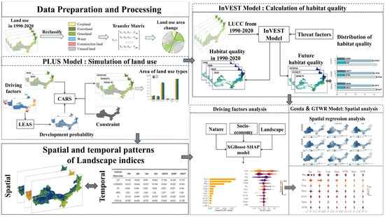 This study developed an integrated framework for HQ assessment through a multi-method analytical approach. First, land use/cover change (LUCC) dynamics in ASAR (1990–2020) were analyzed, quantifying transition processes using transfer matrices. Second, the InVEST model’s HQ module was employed to evaluate spatiotemporal patterns by integrating ecosystem sensitivity and threat factor distributions. Building on these historical assessments, the PLUS model was coupled to project 2035 land use patterns under three scenarios: natural development (ND), ecological protection (EP), and cropland protection (CP), enabling multi-scenario HQ predictions. Third, Fragstats software was utilized to compute class- and landscape-level indices, applying the moving window method to characterize spatiotemporal changes in landscape heterogeneity. Finally, the XGBoost-SHAP model was implemented to identify key driver contributions and their interaction effects, complemented by spatiotemporal geographically weighted regression (GTWR) to quantify spatial relationships between landscape pattern indices and HQ under future scenarios (Figure 2).