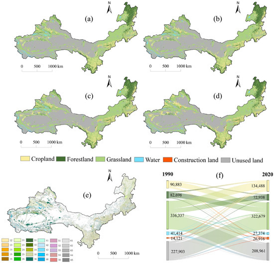Figure 3. Distribution and transfer of land-use types in ASAR, 1990–2020 ((ad) represent the distribution of land use from 1990 to 2020, respectively, (e) shows the spatial transfer of land use in both years, and (f) shows the values of specific transfer changes).