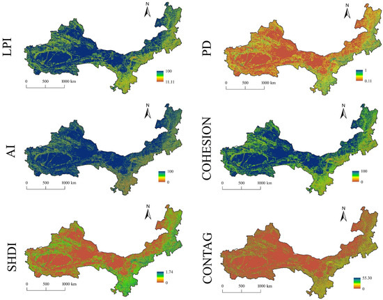 The normalization procedure transforms landscape indices into comparable, dimensionless values ranging from 0 to 1. For a given landscape index X, the normalized value is calculated differently depending on the index’s ecological interpretation: positive indicators (where higher values denote favorable conditions) employ Equation (2), while negative indicators (where higher values suggest degradation) utilize Equation (3). Here, Max and Min represent the respective maximum and minimum values observed in the study region’s sample data. This dual-equation approach ensures proper directionality in the normalization process, maintaining the ecological meaning of each index while enabling their integration into a composite fragmentation measure.