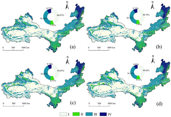 Figure 5. Spatial and temporal distribution of HQ, 1990–2020 ((a): 1990, (b): 2000, (c): 2010, (d): 2020), Note: HQ I–IV represent I (0–0.3), II (0.3–0.6), III (0.6–0.9), and IV (0.9–1).