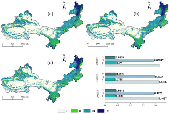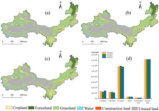 The PLUS model was employed in this study to simulate and project land-use patterns in ASAR for 2030 under three distinct scenarios. As illustrated in Figure 6, the natural development scenario reveals notable changes in land-use distribution compared to 2020 baseline conditions. While landscape types maintain relative stability overall, key transformations emerge: Arable land shows a significant reduction of approximately 1.41 × 104 km2 (4.97% decrease), whereas forested land remains largely unchanged. Conversely, we observe expansions in grassland (7.61 × 103 km2 increase), water bodies (1.51 × 104 km2 increase, predominantly in the Tarim Basin and Tianshan Mountains periphery), and built-up areas (4.13 × 103 km2 increase). The urban expansion exhibits distinct spatial concentration patterns, particularly evident in northwestern Xinjiang, Ningxia, central Gansu, and select areas of Inner Mongolia. These projected changes highlight the varying pressures on different land-use types under business-as-usual development conditions.