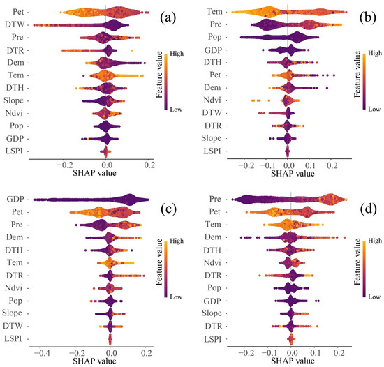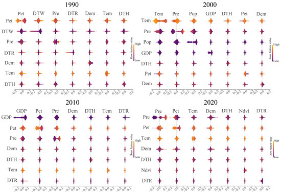 Figure 8. Summary diagram of SHAP feature analysis ((ad) represent 1990–2020, respectively).
