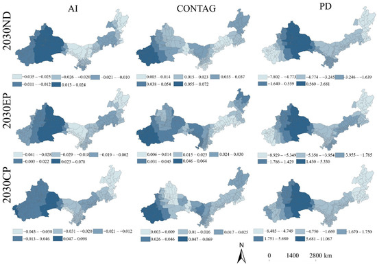 Figure 10. Spatial and temporal distribution of the regression coefficients of the landscape pattern index in ASAR in 2030 (The magnitude of the regression coefficient represents the extent to which the variable affects HQ, using positive and negative values to distinguish between positive and negative impacts, with positive values indicating positive impacts and negative values indicating negative impacts).
