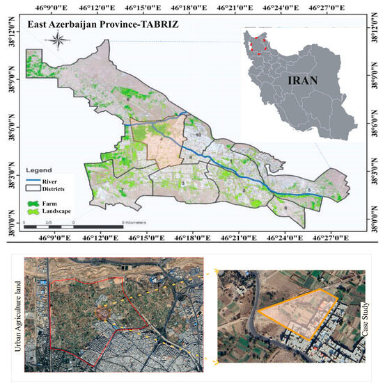 This study was conducted in Hokmabad, an urban agricultural zone in Tabriz, the capital of East Azerbaijan Province, northwest Iran. Tabriz is Iran’s fourth-largest city and is situated at an elevation of 1350 m near the confluence of the Quri and Aji rivers. The region experiences a semi-arid climate, with summer temperatures ranging from 14 °C to 30 °C and winter temperatures between 5 °C and −4 °C. This area has been previously studied by [4], and the same site was selected for continuity and comparative analysis (Figure 1). Given the region’s vulnerability to climate change, as highlighted by previous studies [45], this area is expected to experience significant impacts. These include increased thermal stress, which could affect public health outcomes such as a higher risk of heat-related cardiovascular issues.
