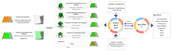 General approach of the study: Simulated thermal comfort analysis using ENVI-met 4.4.6 and RayMan 3.1 software. The Universal Thermal Climate Index (UTCI), Standard Effective Temperature (SET)*, and Mean Radiant Temperature (Tmrt) were used to evaluate the thermal effects of different vegetation scenarios, including combinations of typologies. The study compared a no-vegetation control scenario with various NBS typologies, including agricultural land, broadleaf deciduous trees, edible trees, evergreen trees, ornamental conifers, and shrubs, as well as combinations of these.