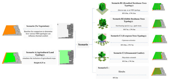 The simulations ran for eight hours, from 10:00 to 18:00, covering peak daytime thermal conditions and the highest risk of heat-related health impacts [48]. One of the hottest days of the year was deliberately chosen for the analysis. The scenarios include different combinations of NBS typologies such as trees (broadleaf, evergreen, edible), shrubs, and green vegetation to simulate various strategies (Figure 3):