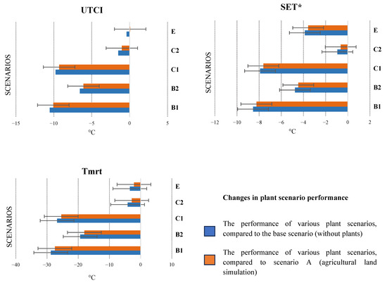 Changes in plants scenario performance, 1.8 m, 8 h (10:00–18:00, based on Local Solar Time—LST). Note. Blue bars represent changes in UTCI, SET*, and Tmrt values for each vegetation scenario relative to a bare, non-vegetated agricultural surface, illustrating the cooling effect of implementing NBS on degraded land. Orange bars show the corresponding changes compared to cultivated cropland with conventional agricultural vegetation (Scenario A), highlighting the additional thermal comfort benefits—or potential limitations—of each plant typology beyond traditional farming. Negative values indicate improvements in microclimatic thermal conditions. Error bars represent the standard error (SE) of hourly simulated values from 10:00 to 18:00 LST, calculated across all grid points within each scenario at the same site. Scenarios include broadleaf deciduous trees (B1), edible deciduous trees (B2), evergreen trees (C1), ornamental conifers (C2), and shrubs (E).