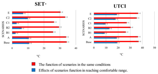 Performance of plants scenario, reaching comfortable range, 1.8 m, 8 h (10:00–18:00) LST. Note: This figure illustrates the thermal performance of vegetation scenarios during a typical hot summer day in Tabriz. The red bars denote the cumulative thermal stress over the 8 h simulation period (10:00–18:00 LST), while the blue bars represent the deviation from the optimal comfort condition—defined as eight continuous hours within the thermal comfort range. According to UTCI, scenarios B2 (edible deciduous trees) and C1 (evergreen trees) demonstrated the lowest overall heat stress and the shortest distance to outdoor thermal comfort, indicating their superior performance in mitigating perceived outdoor heat. Similarly, in SET*, scenarios B1 (broadleaf deciduous trees) and C1 achieved the most favorable results. The consistent effectiveness of C1 across both thermal indices underscores the value of evergreen species in sustaining comfort levels in extreme climates. Conversely, the base scenario (lacking vegetation) exhibited the highest thermal load, while the shrub-only scenario (E) offered minimal improvement. Error bars represent the standard error (SE) of hourly simulated values from 10:00 to 18:00 LST, calculated across all grid points within each scenario at the same site. These findings emphasize the critical role of strategically selected tree species—particularly evergreens and specific deciduous types—in enhancing microclimatic conditions and thermal comfort.