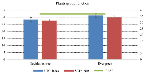 Performance of the plant groups compared to the Base scenario, 1.8 m, 8 h (10:00–18:00 LST). The bars represent changes in thermal indices (UTCI, SET*) for each vegetation scenario relative to the Base scenario. Error bars represent the standard error (SE) of hourly simulated values from 10:00 to 18:00 LST, calculated across all grid points within each scenario at the same site.